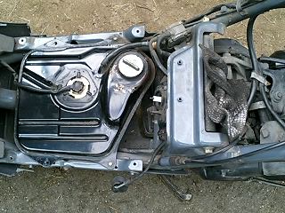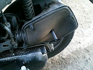 と、主な傷はこれくらいでしょうか。カウルがしっかりはまっていないのは分解してみないとどうにもならないですね。 さて、見分も終わったところでエンジンの復活作業に入ります。 このバイクみたいに放置されていたバイクっていうのは、キャブレターの中のガソリンが腐って変質して、小さな穴を塞いでしまうために キャブを外すには、エアクリーナー周りのものを外さなければいけません。