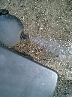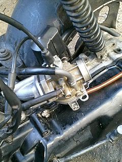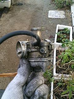 この物体がキャブレターです。キャブの内部が綺麗な場合は、ドレンボルトを緩めると右下のホースからガソリンが外に流れでてきます。 とりあえず、ドレンボルトを緩めてみました。 するとガソリンがホースからサラサラと流れでてくるではありませんか! 異音に気をつけながらガシガシと蹴ること数回…