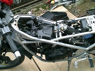 まずはこのようにシート、サイドカウル、リアカウルをとっぱらいましょう。
