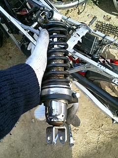 お遊びはここまでw 続きます。 フレームを隅々まで磨くには、ちょっとリアショックが邪魔です。取り外しましょう。